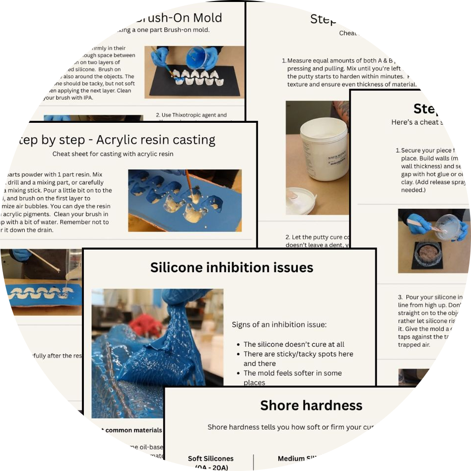 15 tulostettavaa PDF:fää - lunttilappuja muotinvalmistukseen ja listoja tarvittavista materiaaleista.