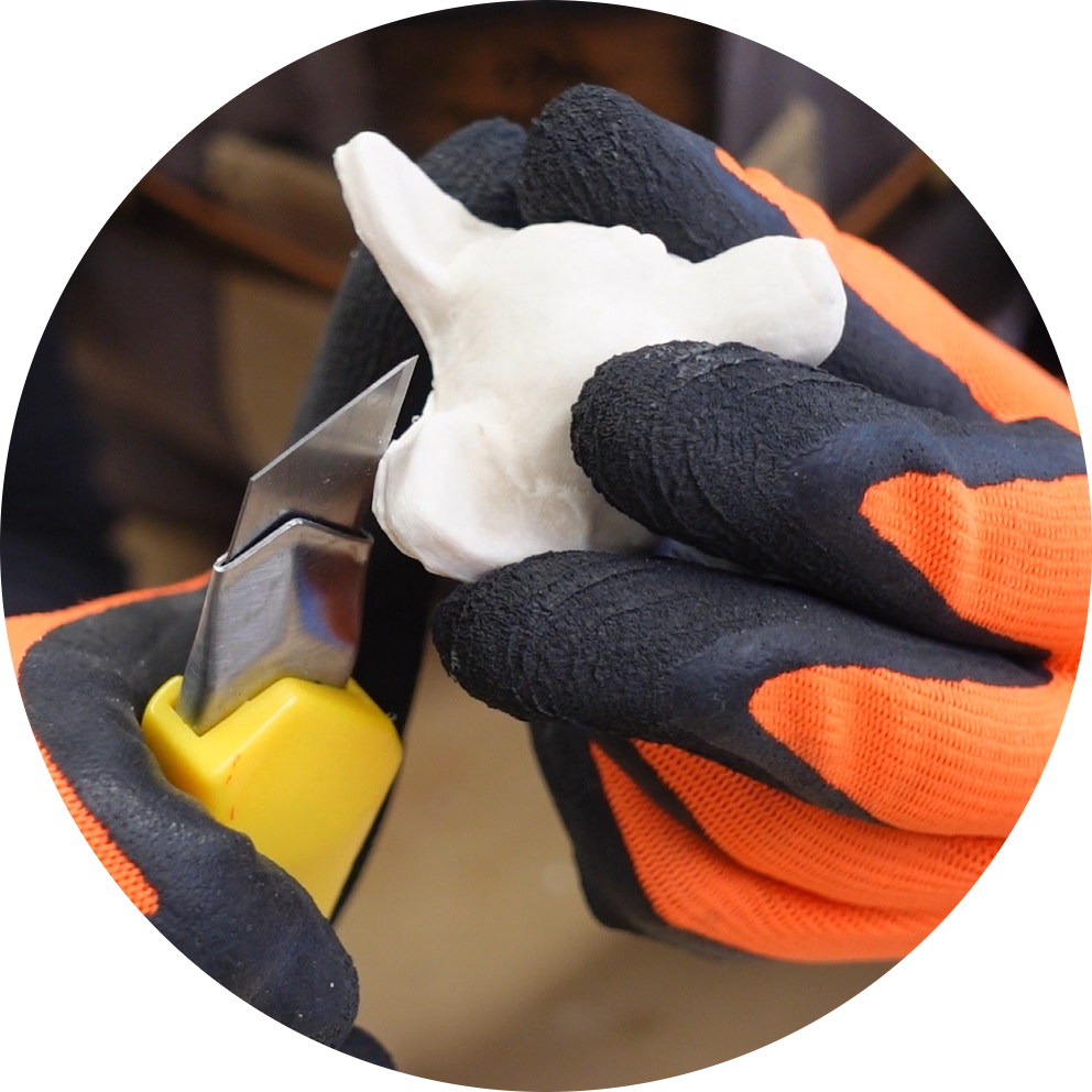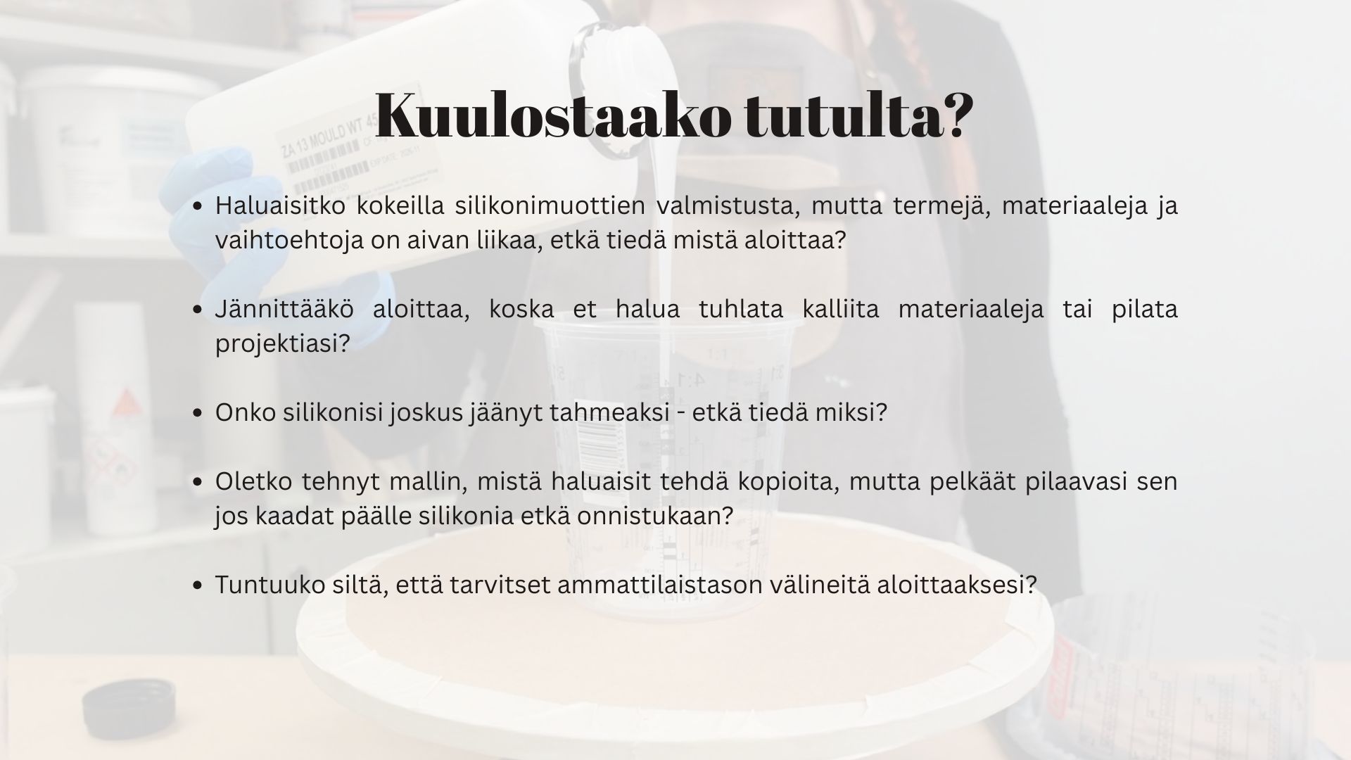 Kun aloitin opiskelemaan rekvisiitanvalmistuksen tekniikoita, tiesin, että minun tulee oppia valmistamaan muotteja. Etsin tietoa netistä ja katsoin Youtube-videoita... hämmentyäkseni vain lisää. Minulle selvisi nopeasti, että vaihtoehtoja on lukemattomia. Niin monia eri silikonityyppejä. Erilaisia tekniikoita erilaisille muodoille. Tutoriaalit olivat selkeitä niille muodoille, joista he ottivat muotteja... Mutta oma kappaleeni oli täysin erilainen. Mitäs sitten tehdään?? Opin kantapään kautta mitä kannattaa, ja mitä ei kannata tehdä. Tärkeä projektini tuhoutui sekunneissa inhibitio-ongelman takia, mihin en ollut osannut varautua. Materiaaleja meni hukkaan ja minun piti aloittaa projekteja uudestaan. Loukkaannuin tehdessäni asioita tietämättä turvallisuusriskeistä. Tämän takia olen luonut tämän kurssin - jotta sinä voisit välttyä näiltä ongelmilta ja onnistua projekteissasi.